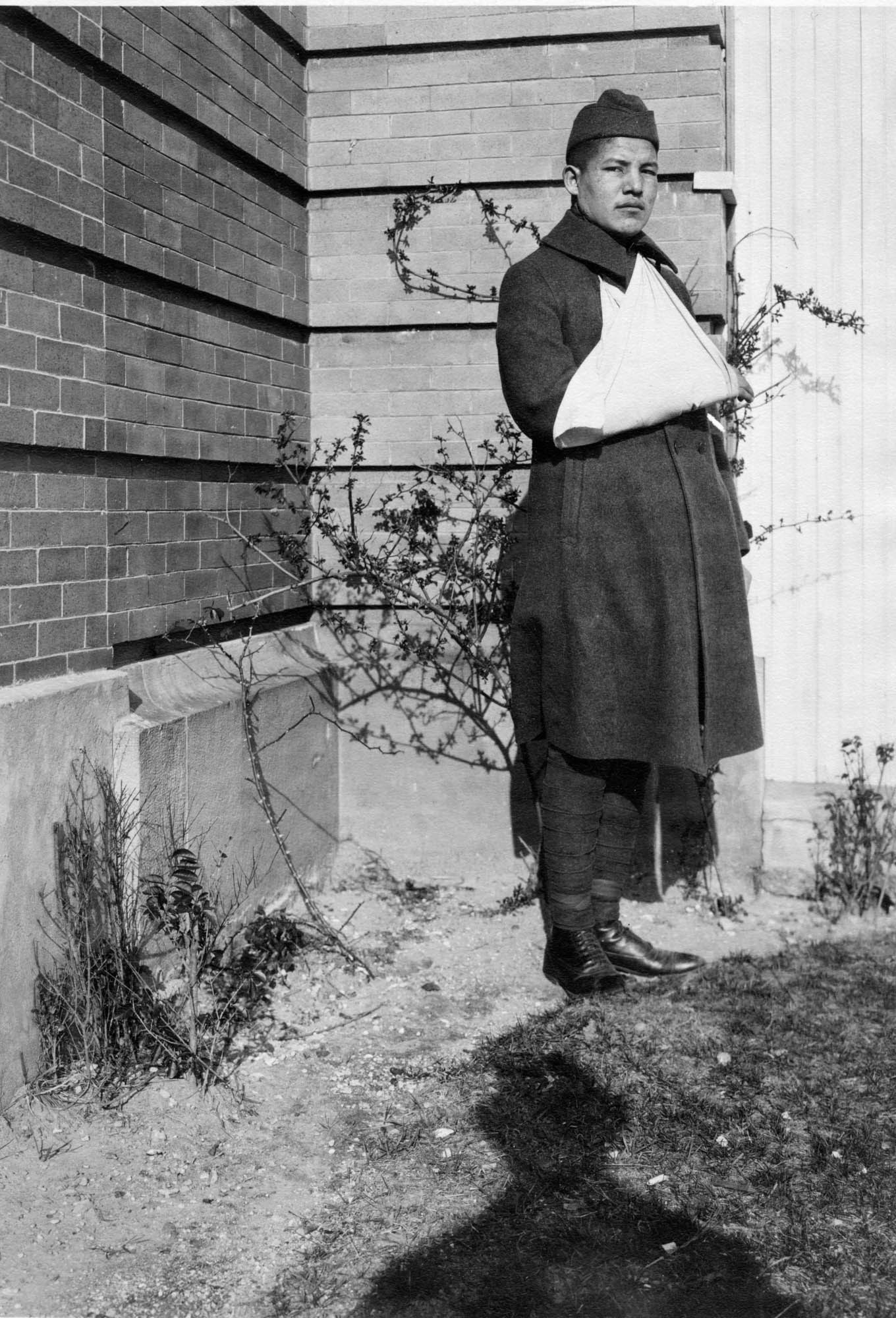 See W6300; [From the negative album: P.O. Address Mauston, Wisconsin; Not a Citizen; Organization Co. D; Wounded in left arm - patrol duty; 128th Infantry; 32nd Division; (note: right arm in sling); See documentation Indian in World War, Book 2]
